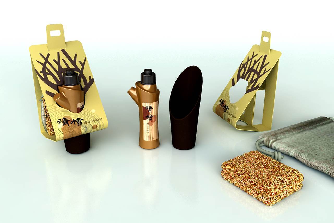 『「清檜」檜木洗碗精戶外便攜組』考量到使用者行為,讓需求一次擁有,瓶身以樹木造型具檜木語意,傳達產品天然訴求;搭配歐美國家行之有年的無痕旅遊概念,隨瓶附贈鏟土器,引導使用者在進行戶外活動時,需挖掘貓洞掩埋清潔碗盤後的汙水,一來加速生物分解,二來也將環境影響降到最低;以天然絲瓜絡取代化學合成菜瓜布,避免野生動物誤食化學合成菜瓜布之碎屑;外包裝選用回收再生紙漿製成之紙板,採用環保大豆油墨印刷,利用結構設計,露出局部產品,搭配平面視覺設計凸顯特色,帶出產品精神與意象,兼具保護產品與展示的功能,並減少至最低的包材用量,徹底友善維護環境,產品細節一一落實綠色設計。