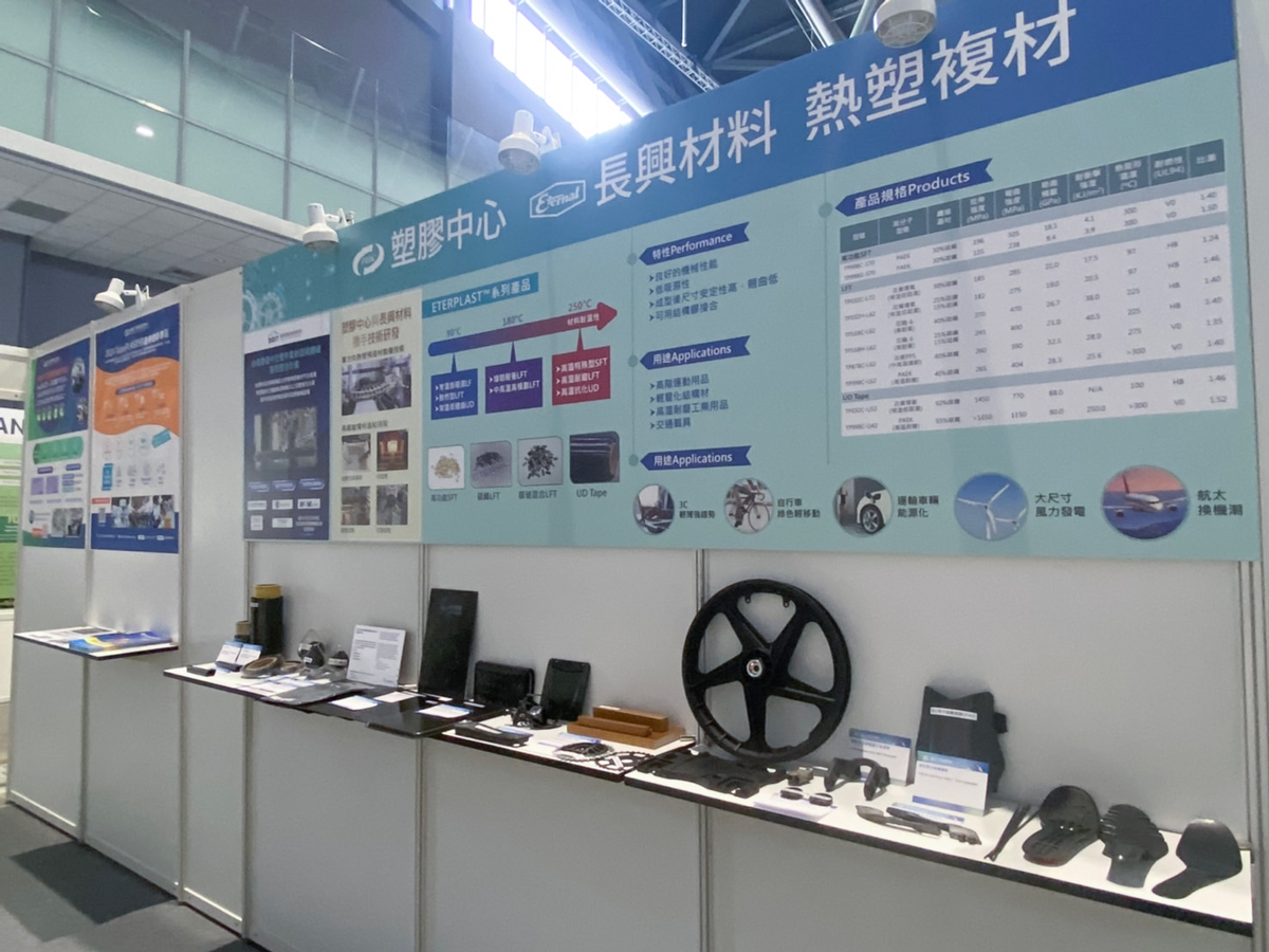 本次展會中,塑膠中心展出熱塑碳纖複材多樣化的前瞻應用潛力,包含於航太、交通產業之應用成果。在經濟部技術司科專計畫支持下,塑膠中心研發「單方向熱塑預浸材製備技術」與「長纖維複材造力技術」。相比於傳統材料,熱塑碳纖複材具有輕量化、高強度等優勢,此外還具有成型週期短、韌性高、易於加工、可回收再利用等特點,符合綠色環保概念。因應全球節能減碳之趨勢,熱塑碳纖複材成為了熱門的研究方向,並帶動千萬級以上的技術移轉,且有著廣泛的應用前景。