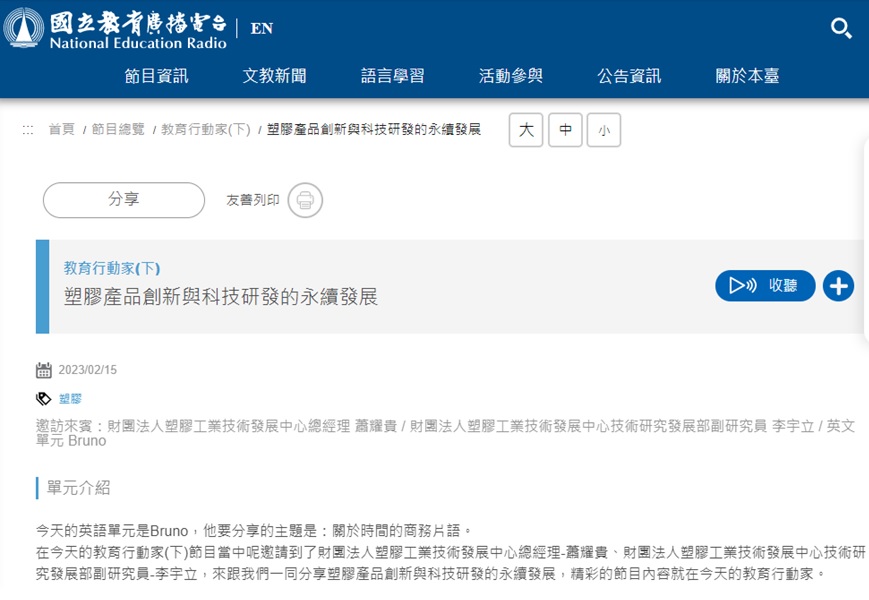 塑膠中心蕭耀貴總經理和研發部李宇立組長,接受國立教育廣播電台專訪,分享塑膠產品創新永續發展議題、經濟部技術處科專成果-混合塑膠循環再生技術及亮點輔導廠商益鈞環保的案例。