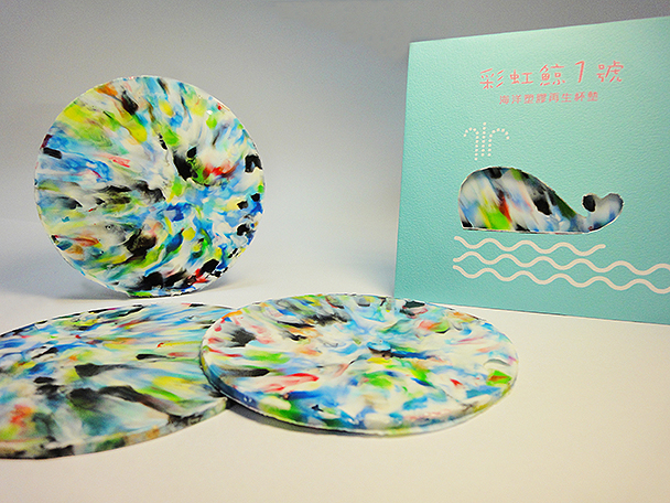 清洗後的回收塑膠瓶蓋,依舊色彩繽紛。以簡單的粉碎工法及熱押製程,化身為潑畫式色彩的杯墊