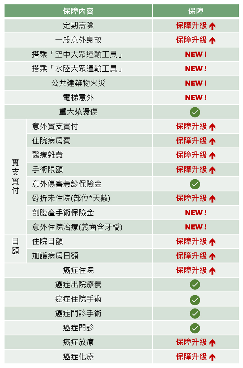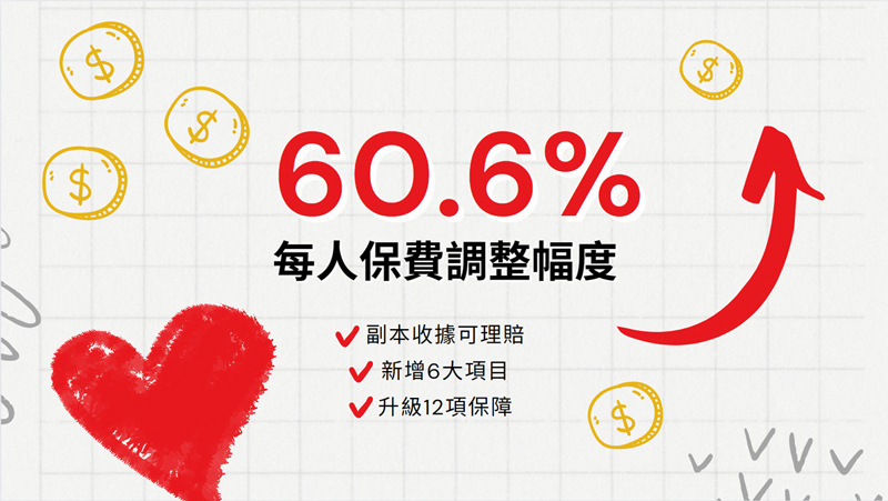 此次保障提升包括新增搭乘大眾運輸工具意外傷害、公共建築物火災、電梯意外、「剖腹產手術保險金、意外住院治療等新增6大項理賠內容,以及定期壽險、一般意外身故、手術和醫療雜費的實支實付、住院日額、癌症化療/放療等多達12個項目的保障升級,總體保費增幅達60.6%。我們深信這樣的提升能為同仁面對健康或家庭緊急情況時提供一個可靠的支持系統。