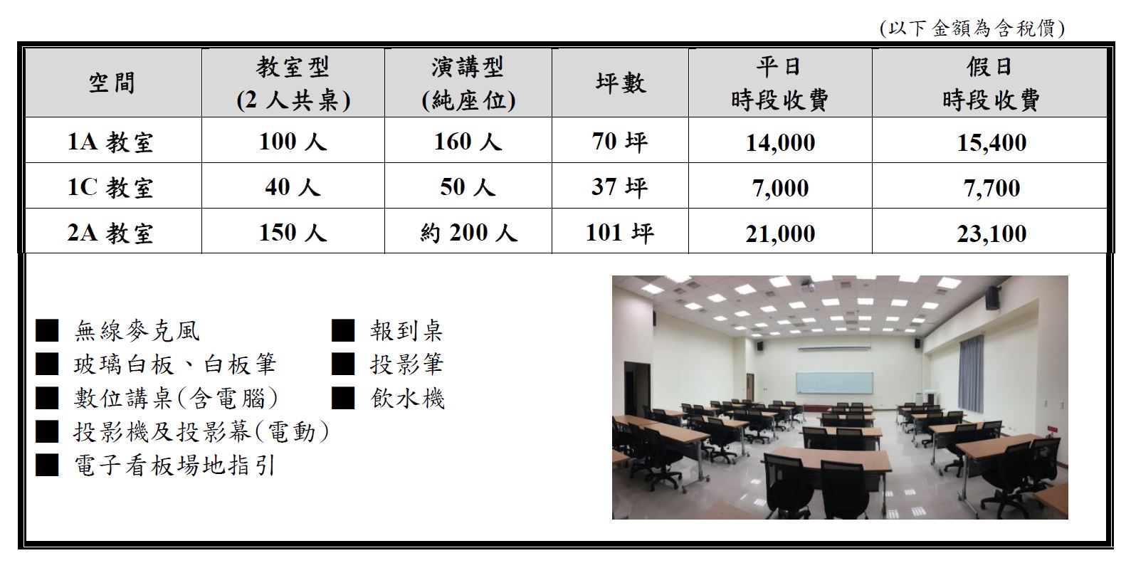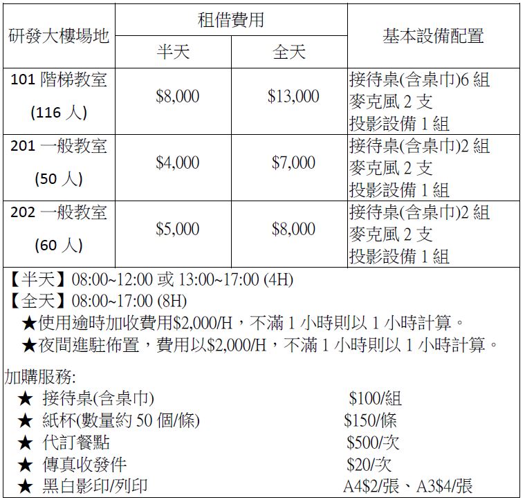 ![]() 請於使用日7天前檢具活動相關文件向塑膠中心承辦人員完成申請,並預付訂金50%;使用當日結清所有費用。 聯絡窗口:04-23595900分機208 (1)本場地不提供夜間及假日租借。 (2)使用逾時加收費用$2,000/H,不滿1小時則以1小時計算。 (3)夜間進駐佈置,費用以$2,000/H,不滿1小時則以1小時計算。 (4)使用期間造成設備、器材毀損,使用單位應負責修復或照價賠償。若於 使用前即發現瑕疵或毀損者,應立即主動告知中心承辦人員處理,如未告知造成害發生,應由使用單位修復或照價賠償。 (5)代訂餐點,須最晚於使用日前4天,確認代訂內容並結清其費用。 (6)相關注意事項,依塑膠中心說明為主。 |