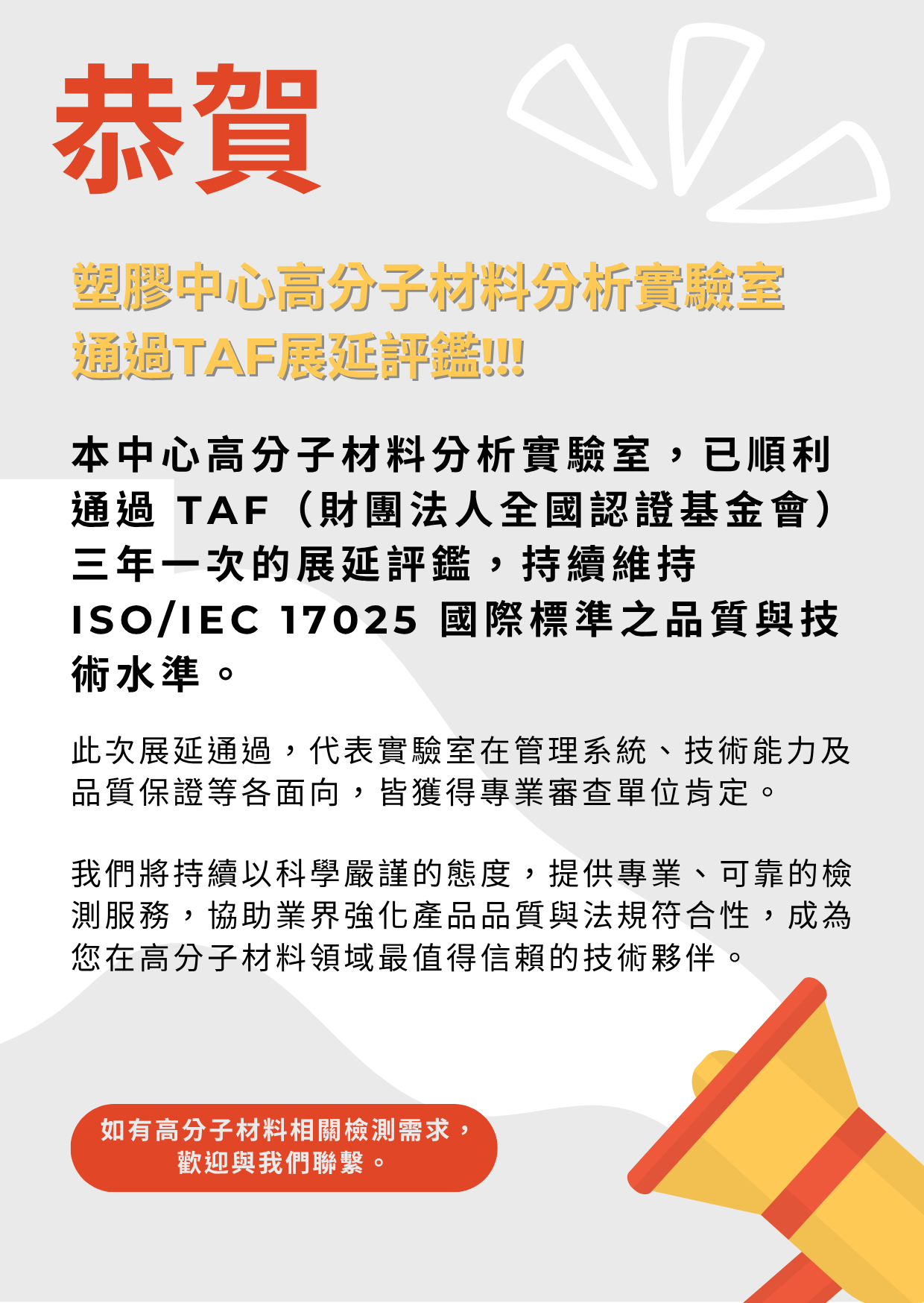 塑膠中心高分子材料分析實驗室 通過TAF展延評鑑