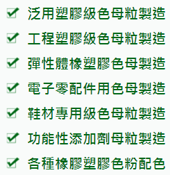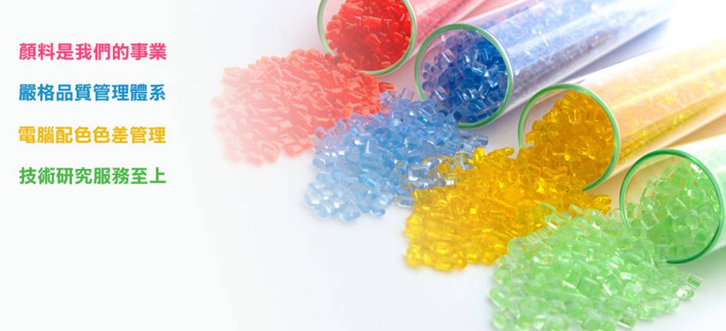 TPU薄膜專用色母粒、TPU.NYLON耐黃變專用色母粒、TPU.NYLON鞋材零配件射出底用色母粒、TPU功能性改質劑母粒、SURLYN高爾夫球用色母粒、PBT電子零配件用色母粒、PC專用色母粒、PET專用色母粒、HYTREL專用色母粒、PA.NYLON專用色母粒、SEBS.SBS專用色母粒。