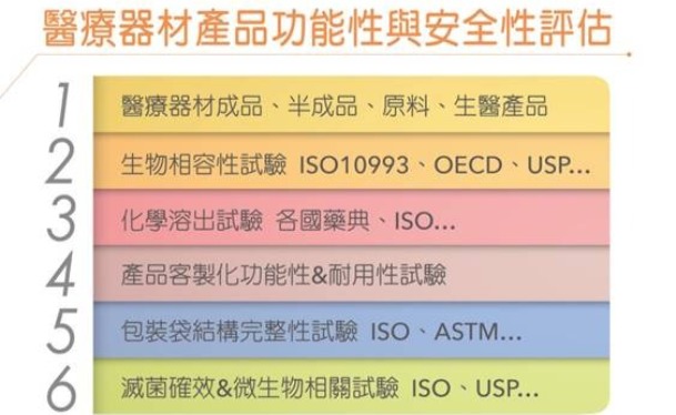 提供生物相容性/化學溶出性/微生物測試/滅菌確效/產品客製化功能性測試/包裝結構完整性測試/產品耐用性測試等服務,以協助廠商完成安全性評估與相關試驗。