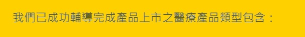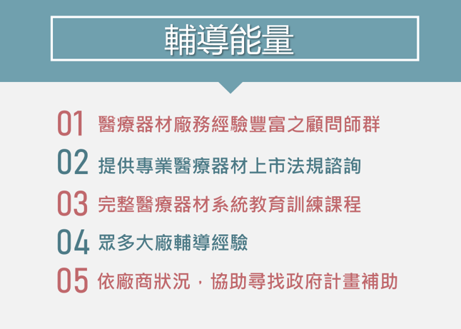 包括品質管理系統(ISO 13485、美國cGMP/QSR(21 CFR 820)、歐盟及各國品質管理系統)、產品上市認證(台灣查驗登記、美國FDA 510(K)、歐盟CE、英國UKCA、東協CSDT技術文件),以加速醫療器材產品上市流程。