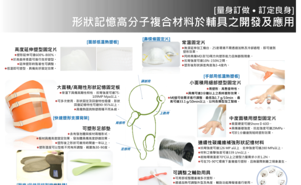 針對廣泛應用於個人用品、照護輔具及醫療產品上,並考量可量身訂做特性提升產品附加價值之前提,因此發展高延伸特性及快速活化形狀記憶高分子材料技術,並經由結構的搭配與設計,發展形狀記憶人體適形與智慧生活相關產品,解決國內現階段產品進口或需仰賴國外技術之問題。 本技術主要目標為透過材料配方調整、分子設計、軟硬段控制等方式將一般泛用塑膠賦予形狀記憶特性,同時亦調整材料適合運用於一般押出、射出、發泡及塗佈等製程用形狀記憶材料。