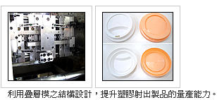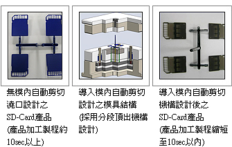 | 產品產量提昇製程開發 針對新產品或既有產品之外觀、功能與結構等,設計具提升量產能力之模具結構,以達到快速量產與高品質之生產效益為目標。 |