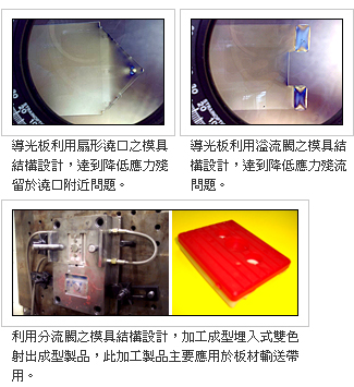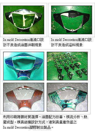 | 表面裝飾技術(In mold Decoration) 針對塑膠射出製品表面之外觀需求、功能、結構設計等,做產品表面美觀之效果,以輔助產品達到高價值之商業化經濟效益為目標。 |