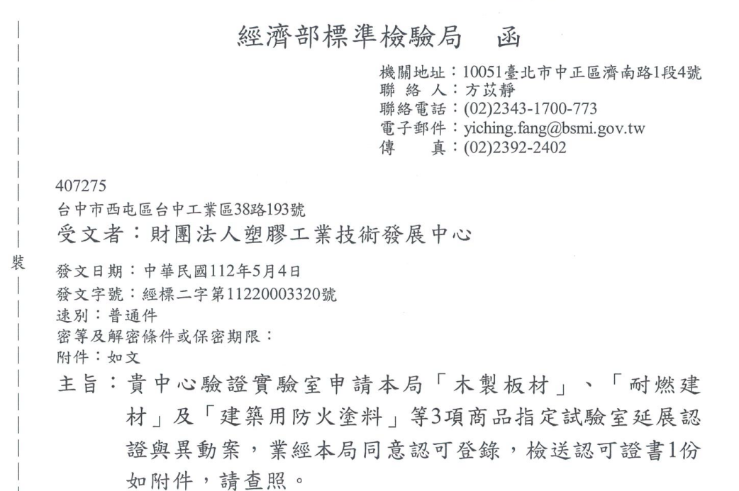 塑膠中心驗證實驗室取得GMW 14797 汽車塗料內裝飾件TAF認可資格,並取得認證證書