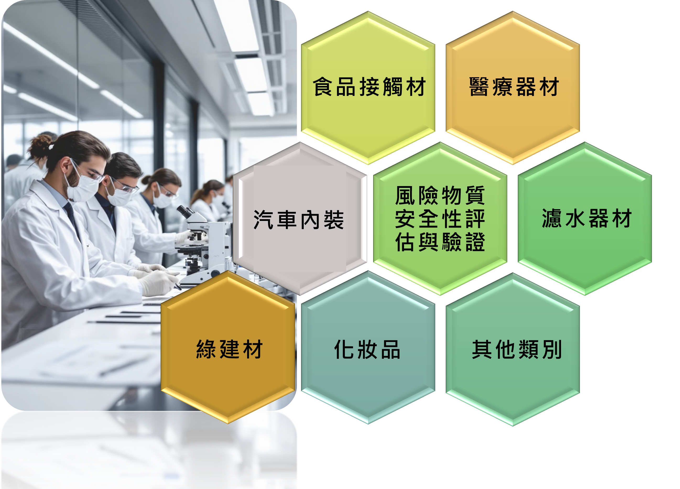 這些評估廣泛應用於不同領域,包括食品接觸材料、醫療器材、汽車內裝、濾水器材、綠建材和化妝品等,以保障產品的安全性和品質。