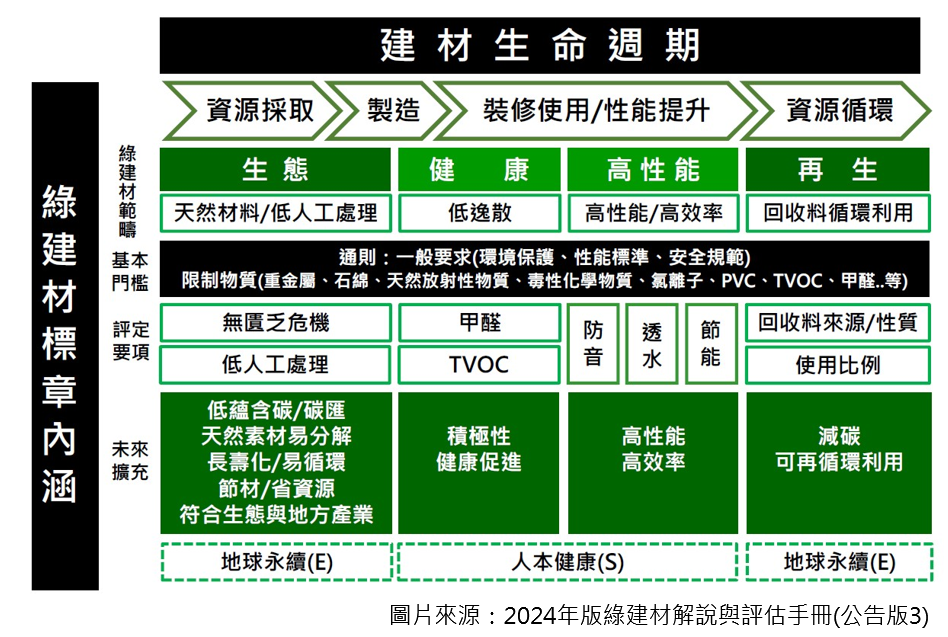 我們一生約90%以上時間是處於廣義的建築室內空間中,而我們的居住空間普遍都具有一定的裝修的,因此室內環境品質與空間裝修建材及傢俱息息相關,綠建材標章重點涵蓋「環境」與「人」兩個面向