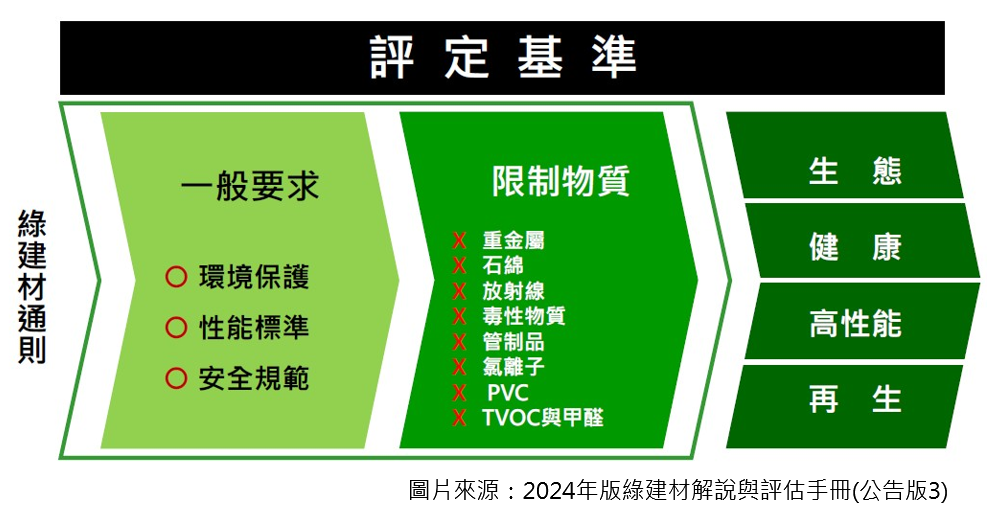 產品在申請綠建材標章中四大分類(生態、健康、再生、高性能)個別評定基準前,都需要符合以下通則的要求:
