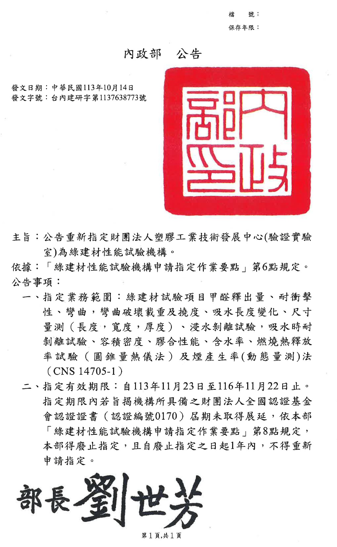 綠建材標章申請文件中產品規格標準試驗報告需優先選擇認可認證試驗機構出具的報告,塑膠中心驗證實驗室113年11月23日取得指定「綠建材性能試驗機構」認可,提供綠建材通則要求中檢測服務。業務範圍: