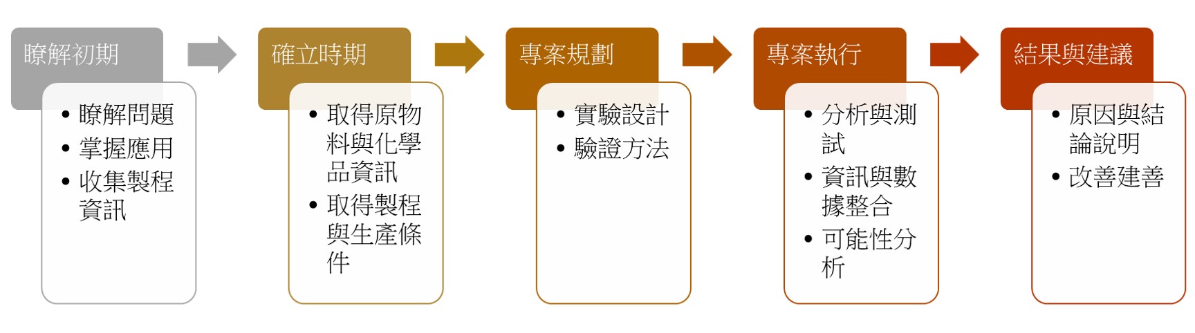 整體服務過程將採用嚴謹與詳盡的方式,進行專案規劃。確保各階段均擁有充足的資訊,避免分析過程產生過多的盲點,導致分析與測試方向錯誤,無法順利產生結論與建議。