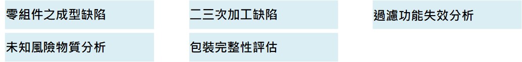案件概述:新開發產品之採用材料出現未知風險物質,開發檢驗方法,模擬應用方式進行安全評估。 缺陷類型:反應副產物、溶出超標、反應不完全等。 應用領域:醫療器材、醫檢設備開發等。 採用方法:使用模擬試驗、風險檢物質鑑別、自訂方法、精確定量。 成效:掌握未知風險、鑑別風險特性、精確物質定量、提供開發新品參考。 |