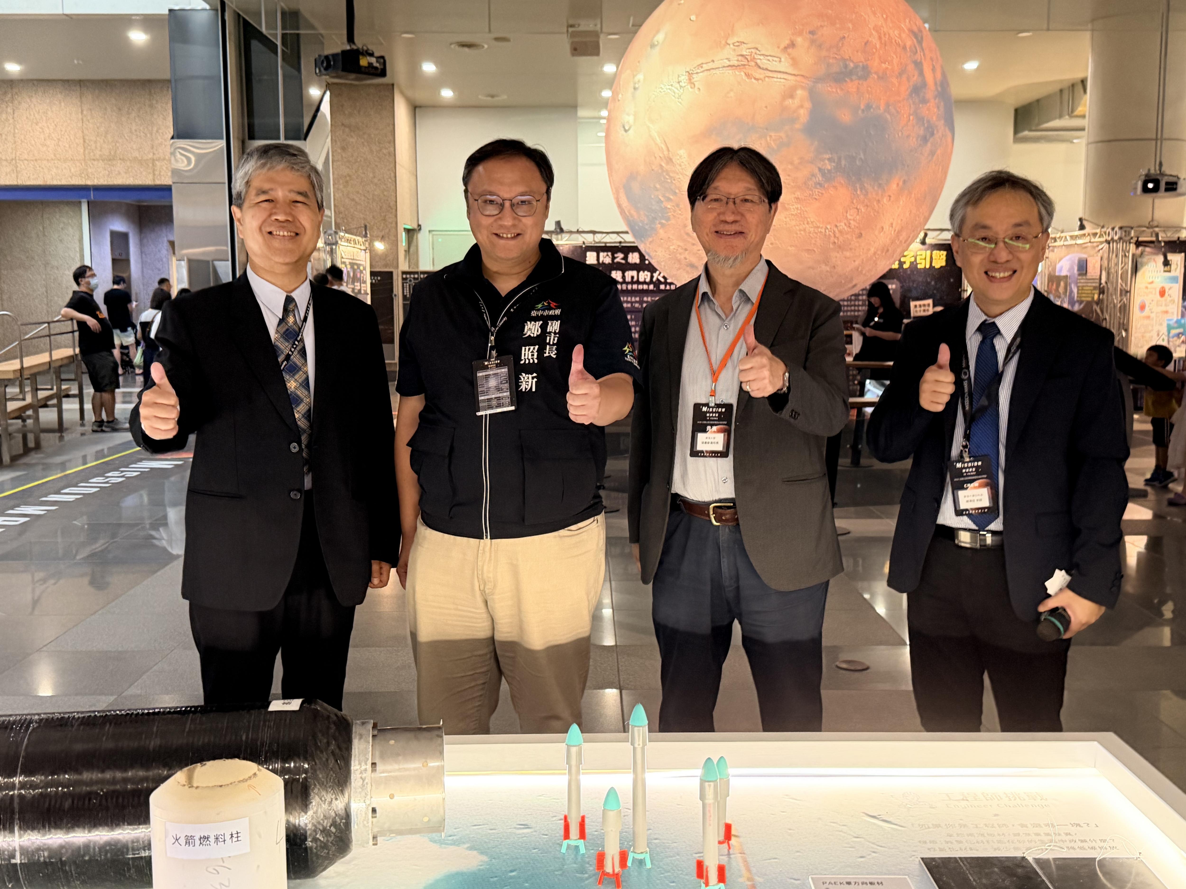 特展開幕式貴賓蒞臨塑膠中心展區參觀與合影。台中市副市長鄭照新(左二)、東海大學副校長張嘉修(右二)、火星任務發起人東海大學生科系副教授趙偉廷(右一)、塑膠中心副總經理薛光瑩(左一)。